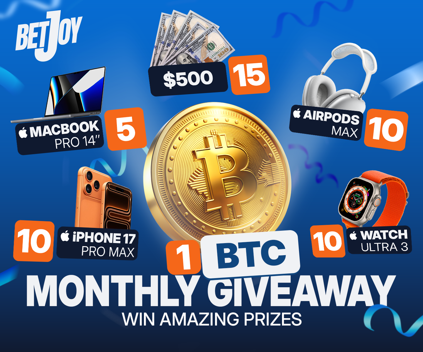 Join BETJOY and take part in an exclusive giveaway: win 1 Bitcoin, 35 Apple gadgets, and cash prizes.